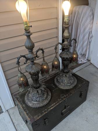 This is a awesome pair of Ornate Hollywood metal table lamps, that are in great working condition.Theres a small crack in one of the ornate pieces, but definitely fixable, and doesn't effect it.