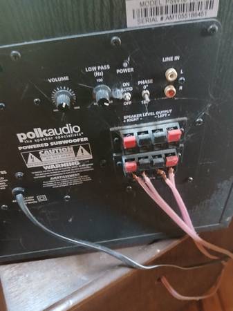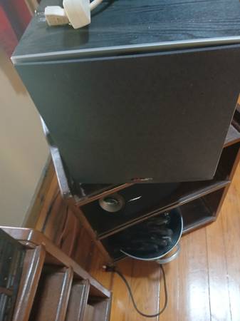 Five stereo system components, sold as a lot. wires included. Pair of Bose bookshelf speakers and one Polk Audio subwoofer. It's a beast.