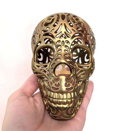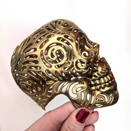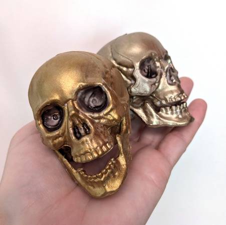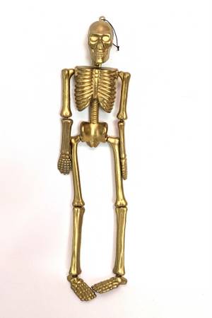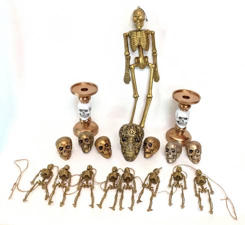 This listing is for a group of gold skeleton and skull decorations. All of these pieces are made of plastic, except for the candle holders, which are resin. Most of these pieces were customized/painted by me. Includes an 18” tall skeleton wall hanging, a garland with 8 mini skeletons (6” tall), six mini skulls with hinged jaws, and a pair of candle holders. The candle holders measure about 7.25” tall by 3.75” wide. They can hold taper candles or pillar candles.