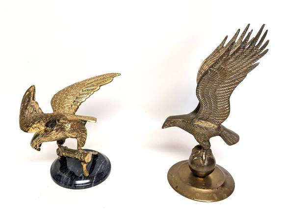 I’m selling a collection of vintage brass eagle statues. The two largest statues with the eagles perched on a branch and a rock measure between 10.75” and 11” tall and between 11” and 14.75” long. The one with the stone base measures about 9.5" tall, 10.25" wide at the wingtips, and about 4 5/8" wide at the base. The one with the eagle perched on a ball measures about 11.5" tall and 5” wide at the base. It has a Leonard label on the base.