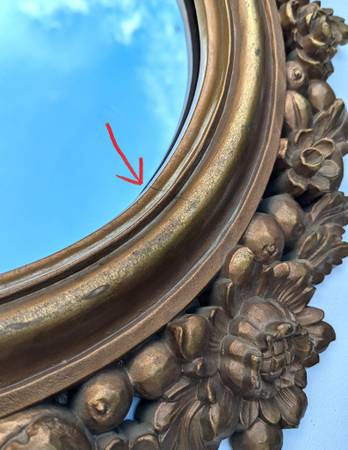 This item is vintage and shows some indications of age/wear, such as some areas of rubbing, wear, or discoloration to the gold colored finish. The frame has a small crack on the lower edge (see detail photo with red arrow). Selling “as is.”