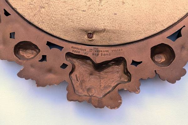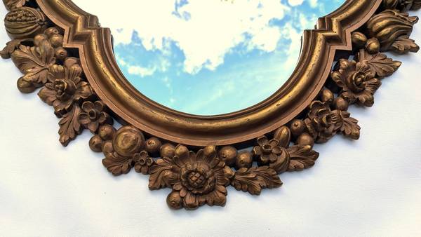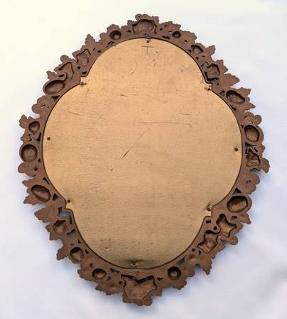 I'm selling a large vintage wall mirror which has an ornate quatrefoil shaped frame with a fruit motif. The frame is made of a molded plastic resin material with a dark gold colored finish. It measures about 29.75” tall by 24.5” wide. The back of the frame is marked "Copyright 1966 Syroco." The mirror is really heavy - while it does have a single metal hanging tab on the back, I would recommend a more secure way of hanging.