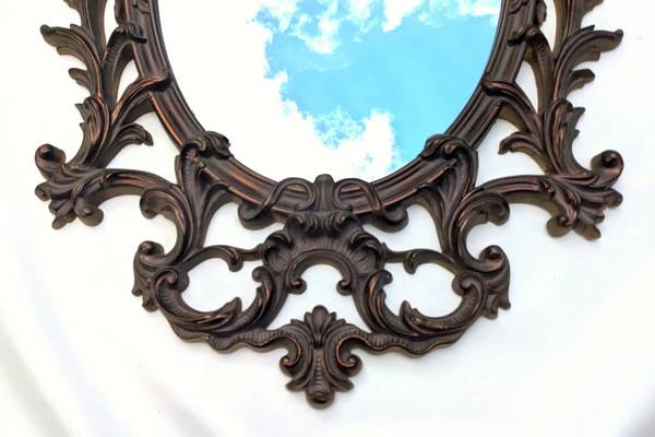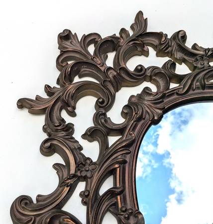 I’m selling a large vintage wall mirror which has an ornate frame. The frame is made of a molded plastic resin material and has a dark gold colored finish. It measures about 36” tall by 23 1/8” at the widest point. It has framing wire on the back for wall display. There is a Turner company label on the back.
