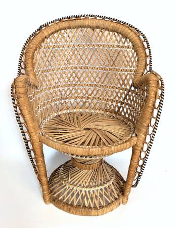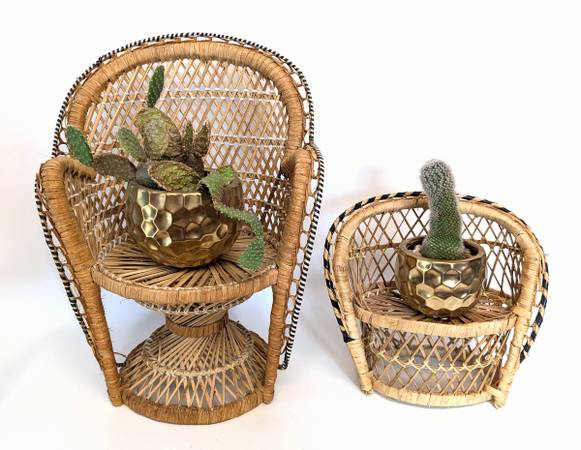 I’m selling a set of small vintage wicker peacock chairs which are doll sized (measurements below). They make great stands for small houseplants (plants/planters shown in photos are not included). The larger chair measures about 16.5” tall, 12” at the widest point, and about 7.75” wide at the seat. The smaller chair measures just under 9” tall, 10” at the widest point, and is about 7” by 4.5” at the seat. The smaller chair has the original manufacturer’s tag dated 1990.