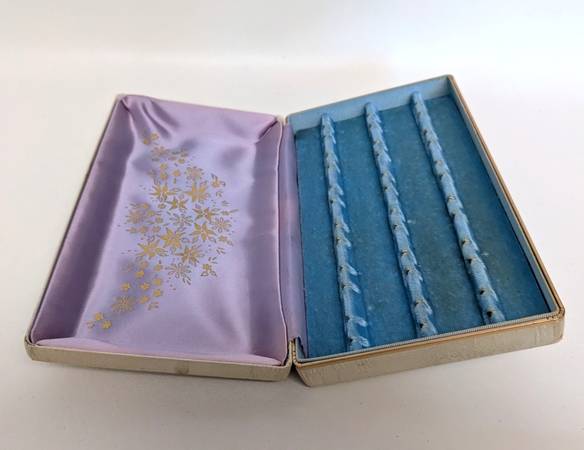 I’m selling the pictured vintage travel jewelry box which has a white exterior with a floral motif, and has a purple satin and blue velvet interior with notches to hold 18 pairs of stud earrings. It measures about 8.75” by 5” by just under 2”. This item is vintage and shows some indications of age/wear – selling “as is.”