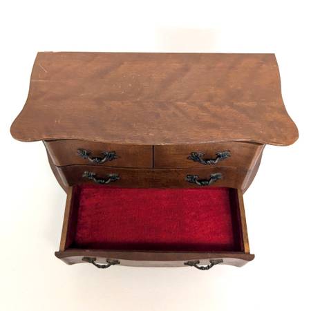 I’m selling the pictured vintage wooden jewelry box which looks like a small dresser and has several drawers lined with red velvet. It measures about 11” wide, 8” tall, and 5.25” deep. It has a label on the underside which reads “Japan.”