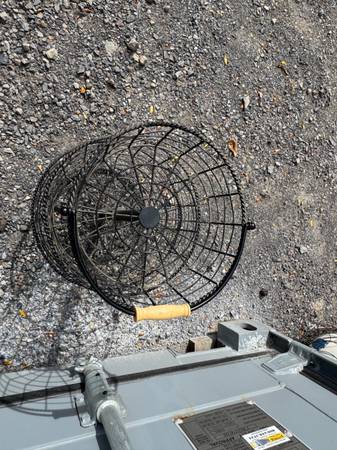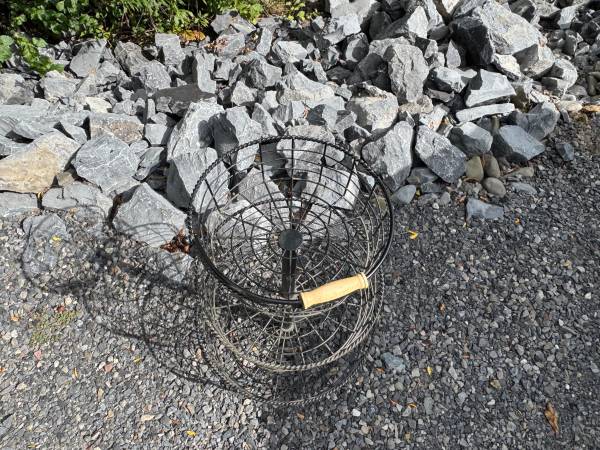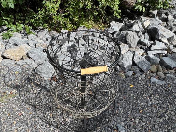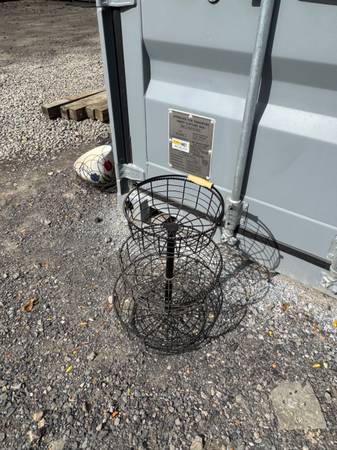 Great Condition Metal storage rack with handle for easy carrying. Measures 21" tall x 15.5" wide at base x 11" wide at top. Located in Lansing, N.Y.