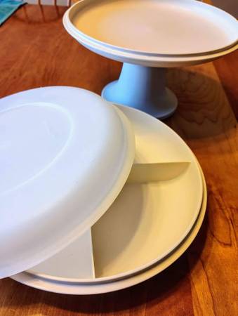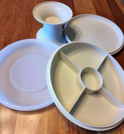 4 pieces Tupperware divided serving tray. Comes with a lid for easy transport, an extra platter and a pedestal for stacking. The pieces snap together and can be mixed and matched. Great for...