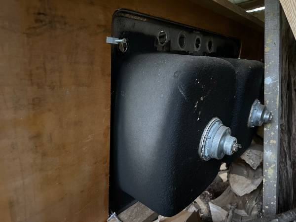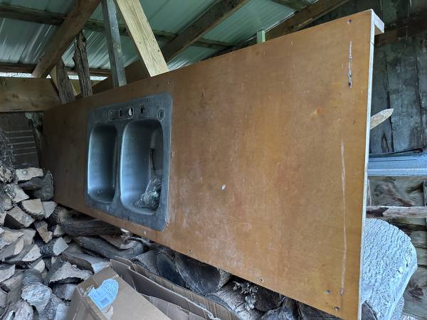 Stainless steel sinks in wood counter with some assorted hardware Counter is 8’2” x 2’3”